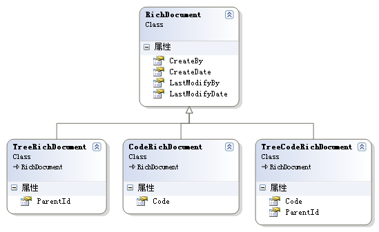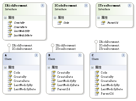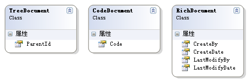 OK,回到话题,假设我们正在开发一个进销存系统,我们总结出所有的文档都需要修改记录(RichDocument),而所有的树都需要ParentId(TreeDocument),而大多数的文档需要Code字段(CodeDocument)。