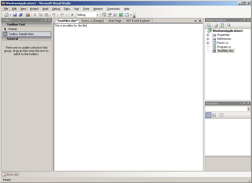 这个例子展示了如何使用一个包(Package)来扩展Visual Studio,使之支持一个特定文件类型的编辑器并附带工具箱支持,在这个例子中我们将实现一个 .tbx文件的编辑器以及一个可用于此文档的工具箱项目。