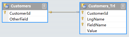 第一种方式是建立一张子表,U9大概就是这个样子,你需要注意的是,每一个实体如果包含多语言字段,都会出现以_Trl为后缀的表。也许你会觉得麻烦,其实不然,这些都是平台在后台自动处理了,你仅仅需要标记这个字段是多语言字段就可以了。