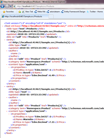 最终我们完成了只读方式的数据查询功能,键入:http://localhost/simple.svc/products看起来像这样: